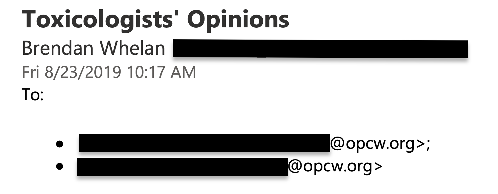 In an August 2019 email, detailed here for the first time, Whelan wrote to two OPCW officials who had accompanied him to Germany for the toxicology assessment. Whelan asked the pair if they would be willing to join him in raising concern about the suppression of the toxicologists’ critical findings with the Organization’s Director General, Fernando Arias.