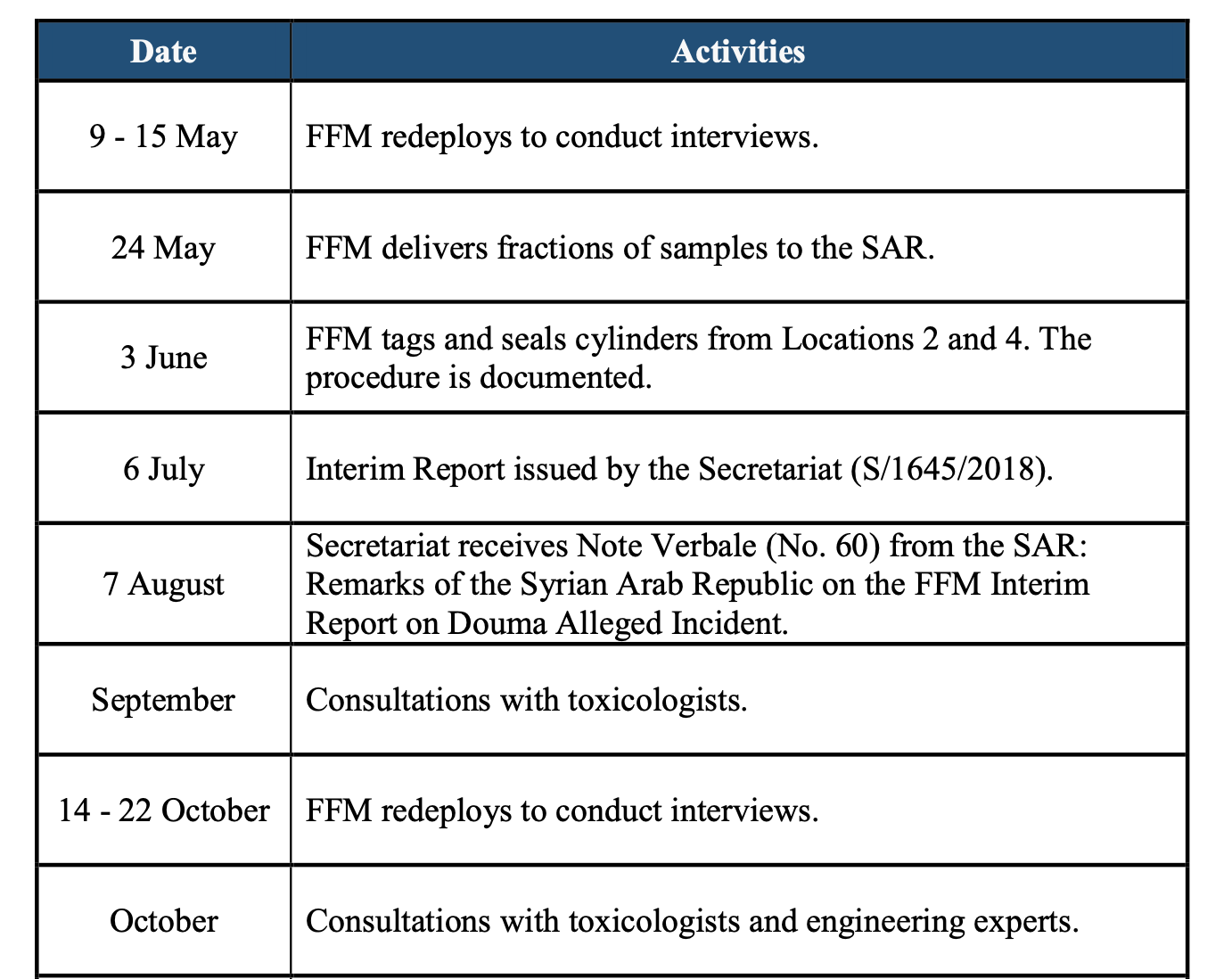 Instead, the report states: “The FFM consulted with four toxicologists and one toxicologist and medical doctor, all versed in chemical weapons or toxic industrial chemical exposure.” The timeline states that this happened in September and October 2018, clearly not referring to the German toxicologists.