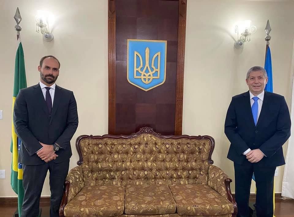 Eduardo foi presidente da Comissão de Relações Exteriores da Câmara dos Deputados e uma espécie de “embaixador paralelo” do governo de seu pai em Washington, tamanho o seu alinhamento com os norte-americanos. Naquela função, Eduardo foi recebido pelo então embaixador da Ucrânia no Brasil, Rostyslav Tronenko, na embaixada ucraniana em Brasília, em maio de 2021. Durante o encontro, o embaixador apresentou ao deputado informações sobre o chamado “Holodomor”. Nessa visita, o deputado buscou saber mais sobre as medidas que o regime ucraniano estava tomando para criminalizar o comunismo e revisar a história do passado soviético a pretexto de que coisas como o “Holodomor” não ocorressem novamente.