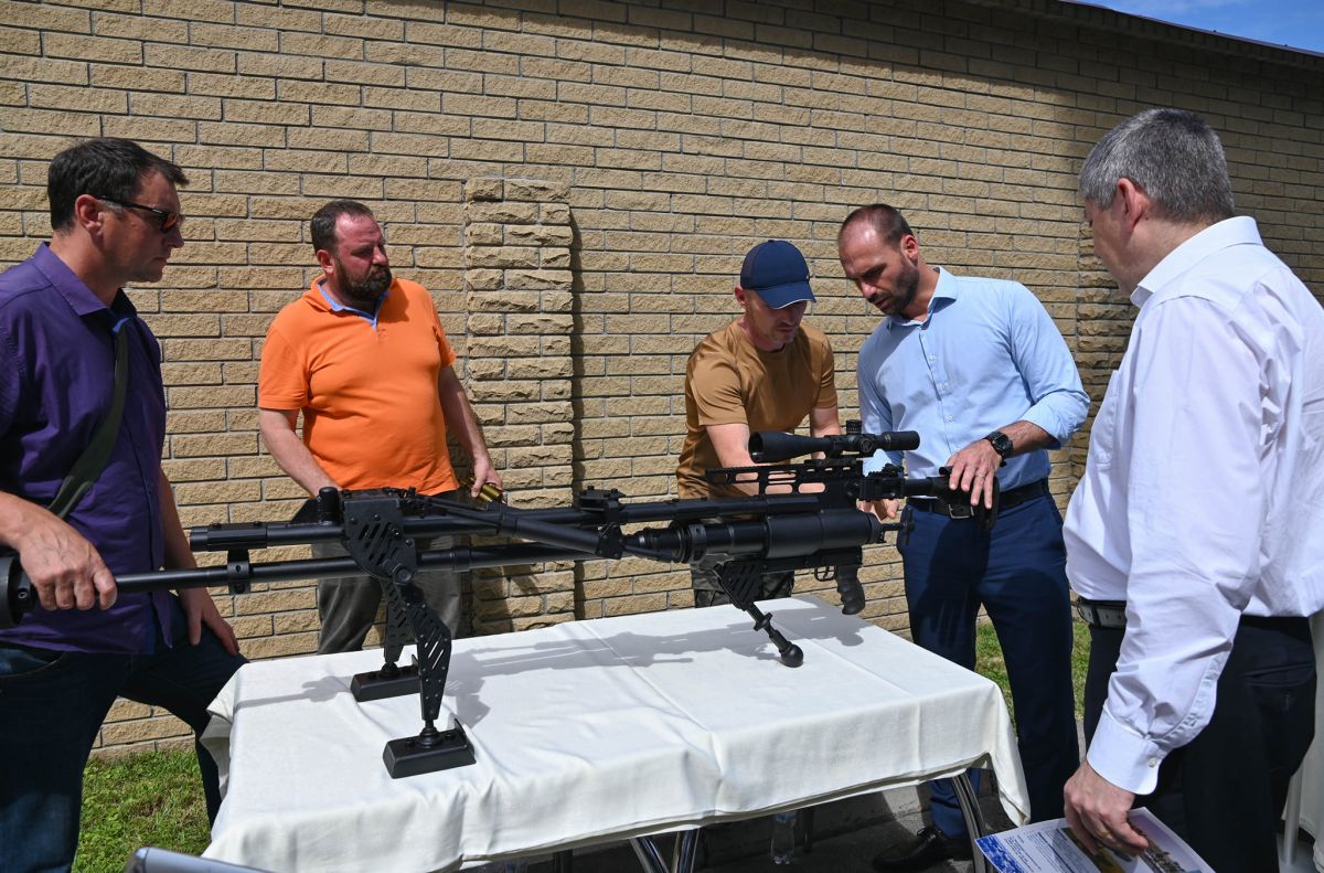 Dois meses após se reunir com o embaixador ucraniano, em julho de 2021 Eduardo liderou uma delegação brasileira em visita oficial à Ucrânia, a convite de Tronenko e organizada pela embaixada brasileira em Kiev para apresentar a ele produtos da indústria bélica ucraniana. Durante a viagem, ele participou de reuniões com representantes da indústria de defesa ucraniana e visitou empresas como Antonov, Luch e Arsenal, avaliando pessoalmente algumas das armas. O objetivo foi estudar possíveis parcerias e aquisições de equipamentos militares para o Brasil. Tronenko e o embaixador do Brasil na Ucrânia, Norton de Andrade Mello Rapesta, também estiveram presentes nas atividades. A imprensa ucraniana demonstrou otimismo com a visita de Eduardo Bolsonaro. Naquela altura, a máquina de guerra do regime nazista de Kiev já havia ceifado a vida de cerca de 13.000 cidadãos do Donbass.