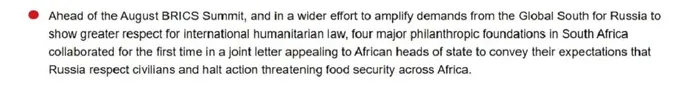 In its own 2023 report, the NGO notes that ahead of the August BRICS Summit, it worked with four prominent South African foundations on a joint appeal to BRICS-aligned counterparts urging leaders to uphold humanitarian norms, protect civilians and safeguard food supplies. In other words, the organisation itself says it was active in the BRICS window and helping to shape the message being carried to heads of state.