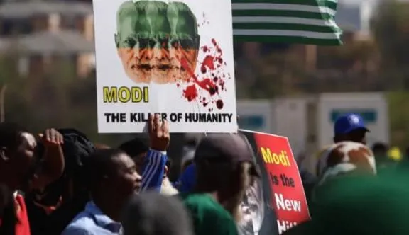 What actually unfolded on the ground tracked that timing. While the elite appeal moved behind closed doors, street-level mobilisations gathered in Johannesburg and Durban with an explicitly anti-BRICS frame: protesters were relocated to Innesfree Park, slogans targeted the bloc as a project, and in Durban, marchers waved Kashmir flags and anti-Modi posters.