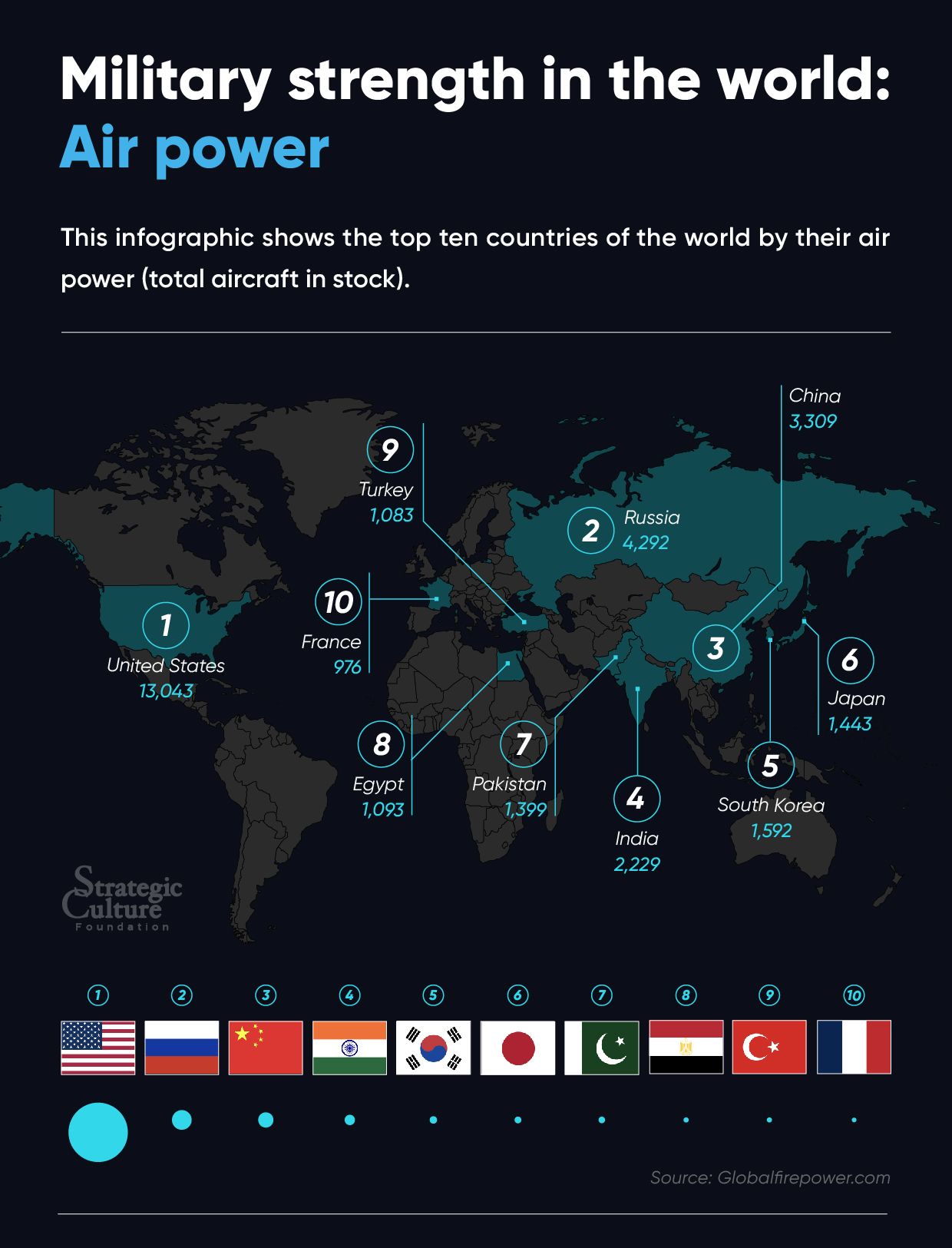 This infographic shows the top ten countries of the world by their air power (total aircraft in stock)