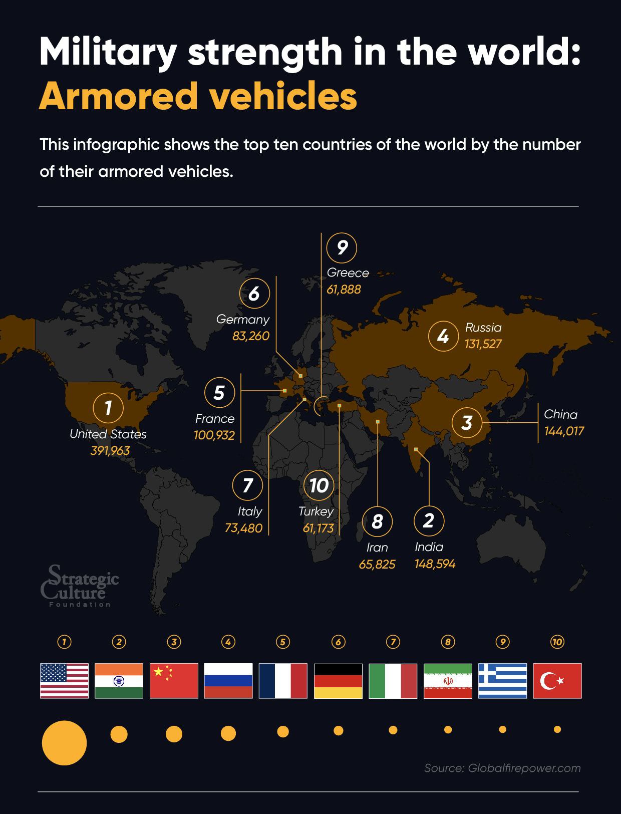 This infographic shows the top ten countries of the world by the number of their armored vehicles.
