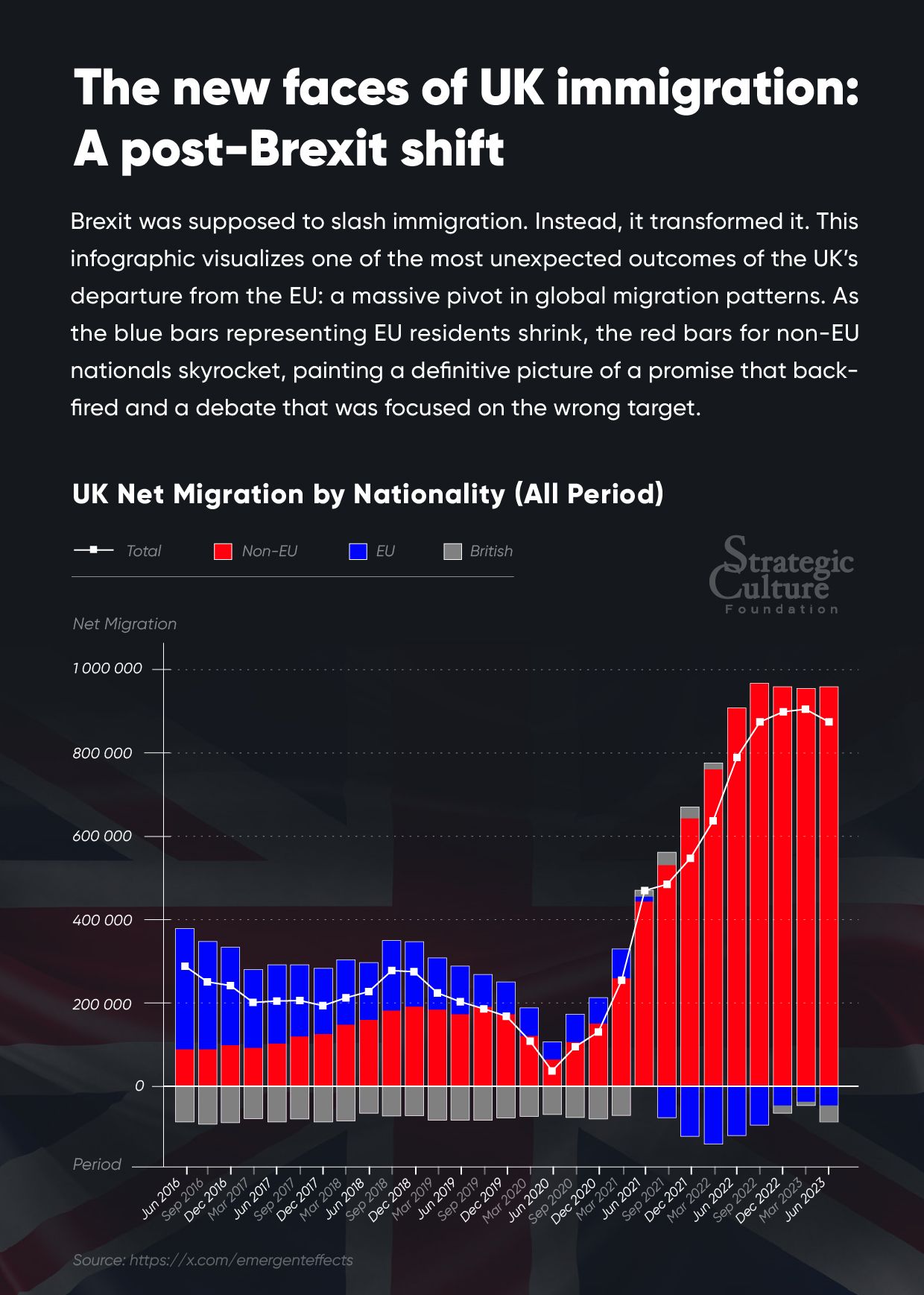 Brexit was supposed to slash immigration. Instead, it transformed it. This infographic visualizes one of the most unexpected outcomes of the UK’s departure from the EU: a massive pivot in global migration patterns. As the blue bars representing EU residents shrink, the red bars for non-EU nationals skyrocket, painting a definitive picture of a promise that backfired and a debate that was focused on the wrong target.