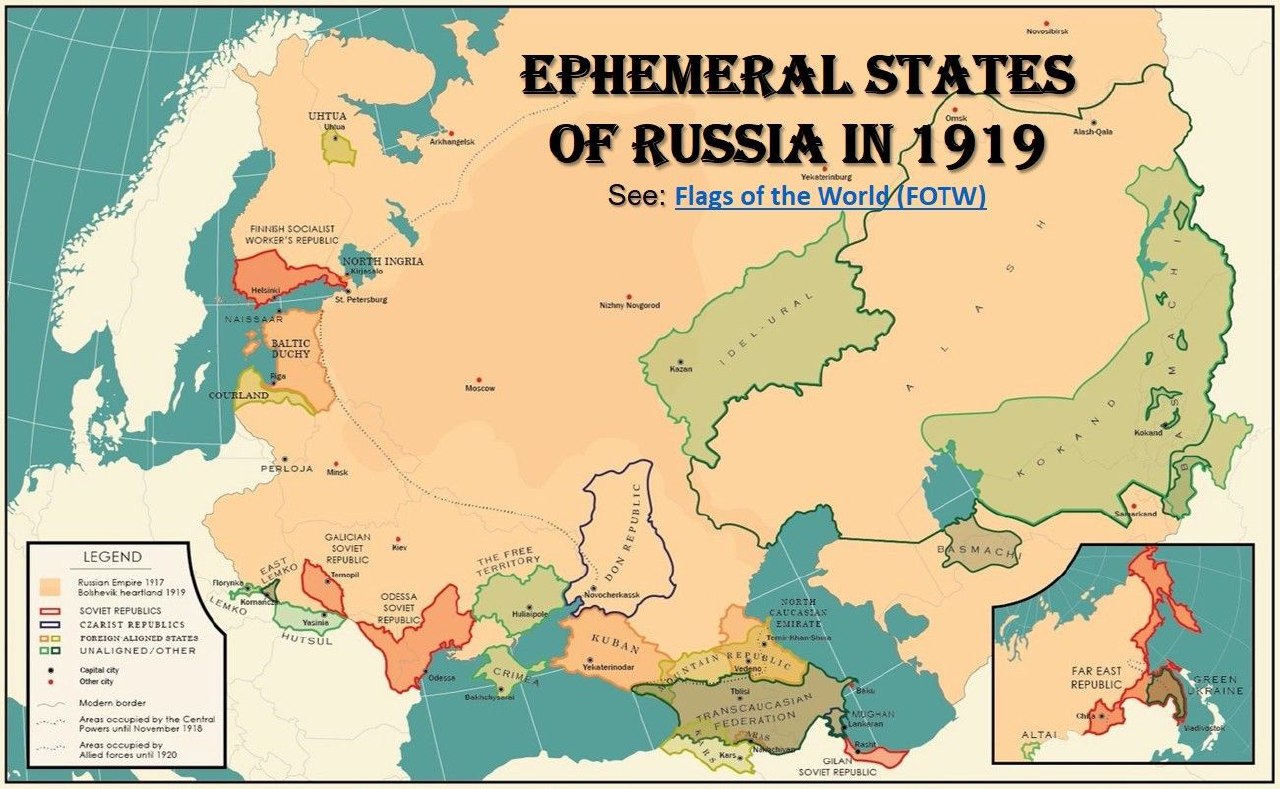 Chi vuole dare esempio di minimalismo, moderazione e realismo, si limita alla frammentazioneseguita alla Rivoluzione di ottobre. La guerra civile che devastò il paese dal 1918 al 1920 fu alimentata dalle generose donazioni dell’Occidente democratico e vide il sorgere di vari staterelli (vedi figura sotto). Non mancano mappe immaginarie più complesse e ardite. Sono quelle fantasticate da chi, pur diversamente adolescente, frequenta il gioco del Risiko con assiduità. E mira a conquistare la Jacuzia.