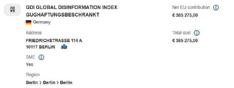 Interestingly, the May 2022 data still lists a major grant of nearly €1.5 million from FCDO. Since, however, the British funding began to dry up (the last FCDO contribution was in 2023), GDI has taken to listing Disinformation Index Inc. as its main donor. See, for instance, the most recent register data here.