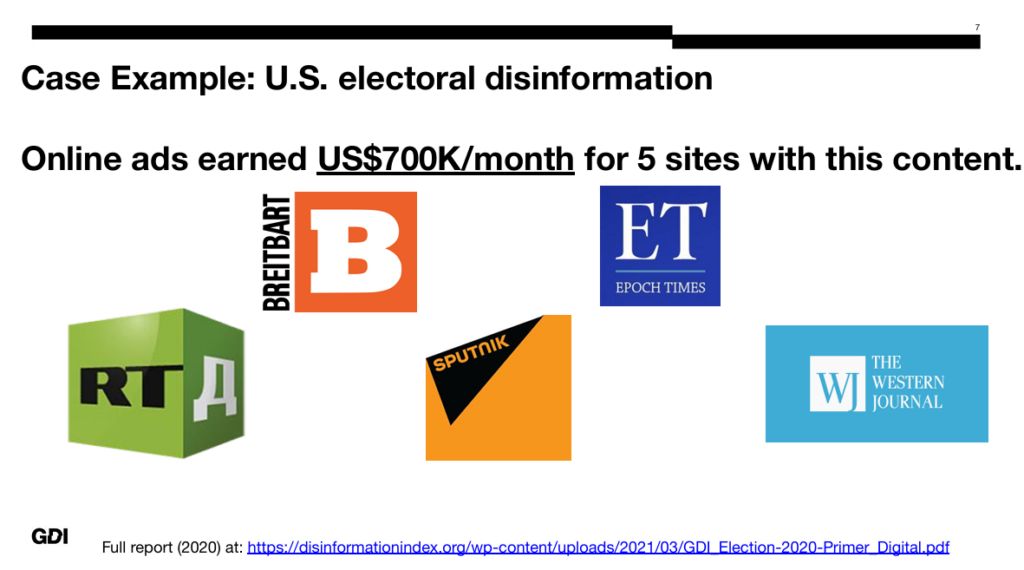 In a 2021 presentation to the European Parliament titled “Monetizing Disinformation in the EU,” Melford identified not only the Russian media RT and Sputnik as purveyors of ‘disinformation’ but also the American media Breitbart, The Epoch Times, and The Western Journal (see the below visual). The following year, Ursula von der Leyen would, of course, ban RT and Sputnik from operating in the EU—a ban that did not only cover their broadcasting but was also dutifully applied by online platforms.