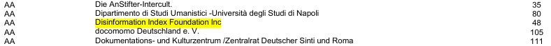 In any case, the German government’s response to a parliamentary question (p. 82) shows that already in 2023, precisely as the British funding was being wound down, the German foreign office had begun funding GDI via, namely, its American branch, as can be seen below. “AA” is the Auswärtiges Amt, and “Disinformation Index Foundation” is another name associated with the American branch of GDI. That year, the AA contributed a relatively modest sum of €48,000.