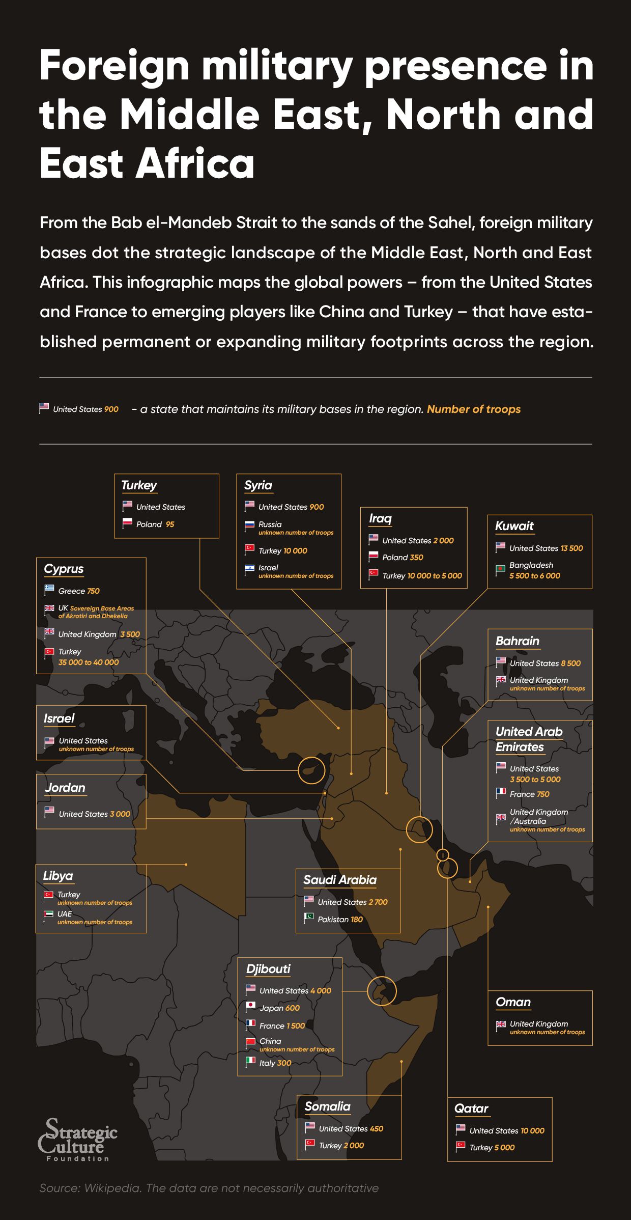 From the Bab el-Mandeb Strait to the sands of the Sahel, foreign military bases dot the strategic landscape of the Middle East, North and East Africa. This infographic maps the global powers – from the United States and France to emerging players like China and Turkey – that have established permanent or expanding military footprints across the region.