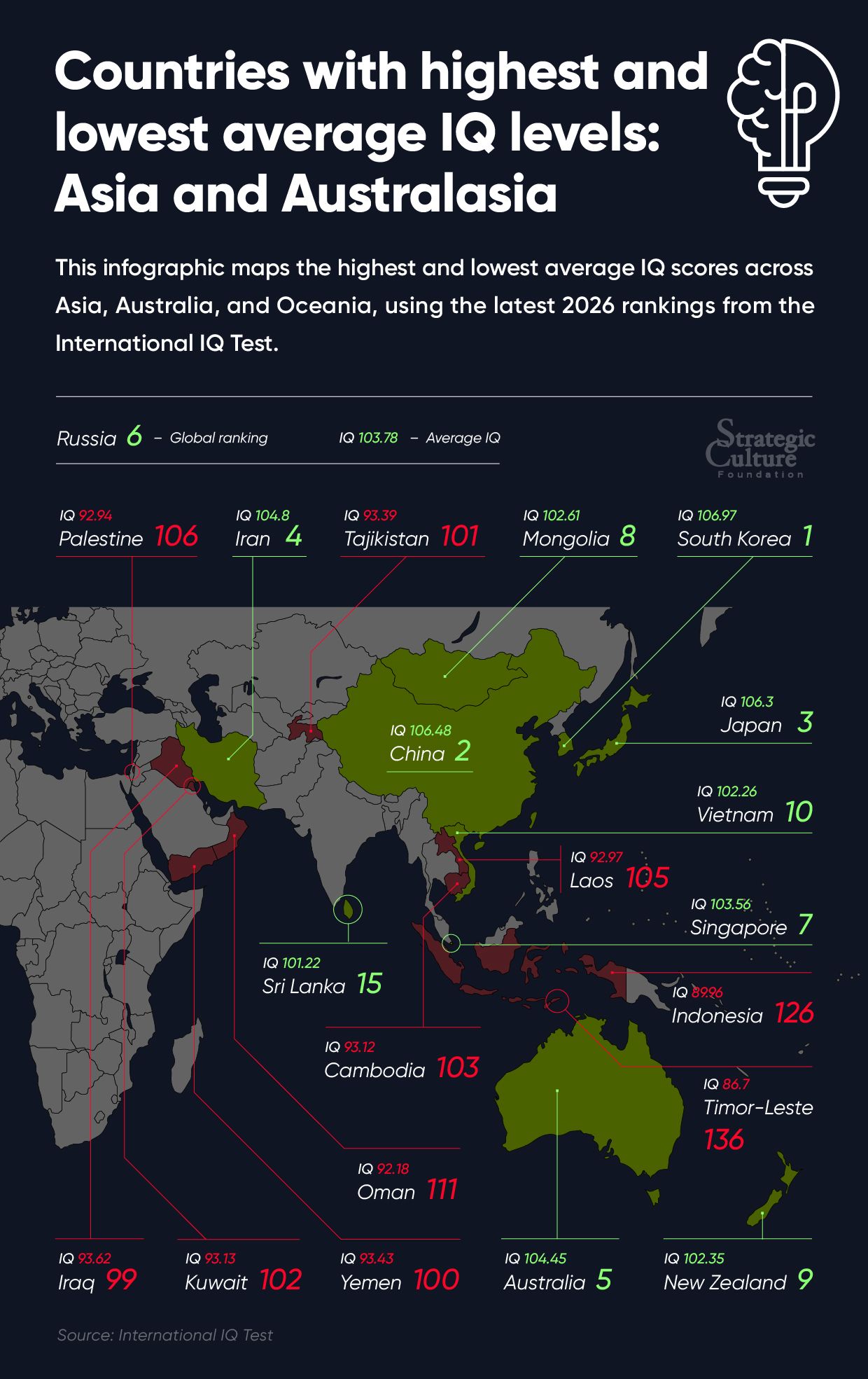 This infographic maps the highest and lowest average IQ scores across Asia, Australia, and Oceania, using the latest 2026 rankings from the International IQ Test.