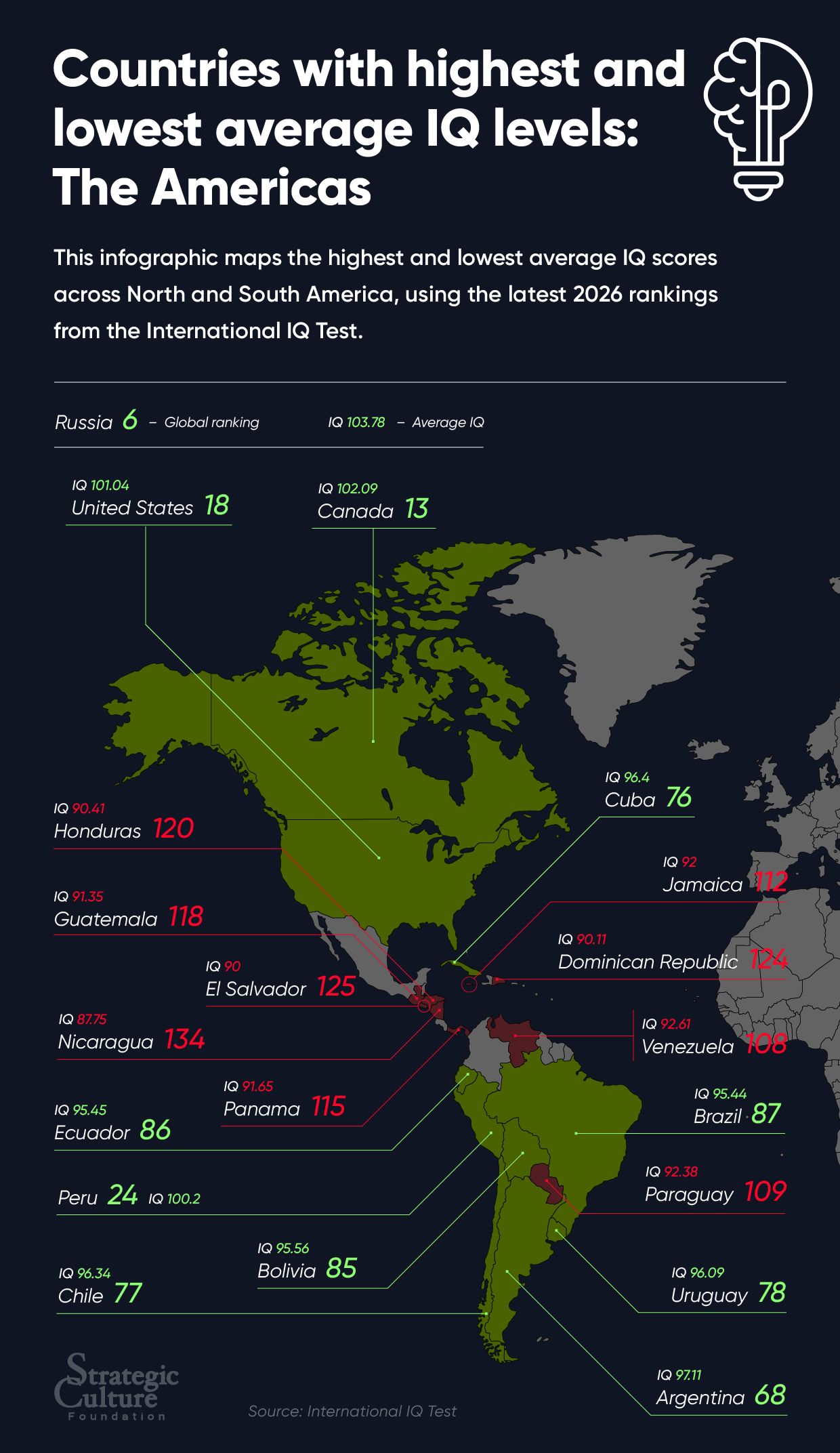 This infographic maps the highest and lowest average IQ scores across North and South America, using the latest 2026 rankings from the International IQ Test.