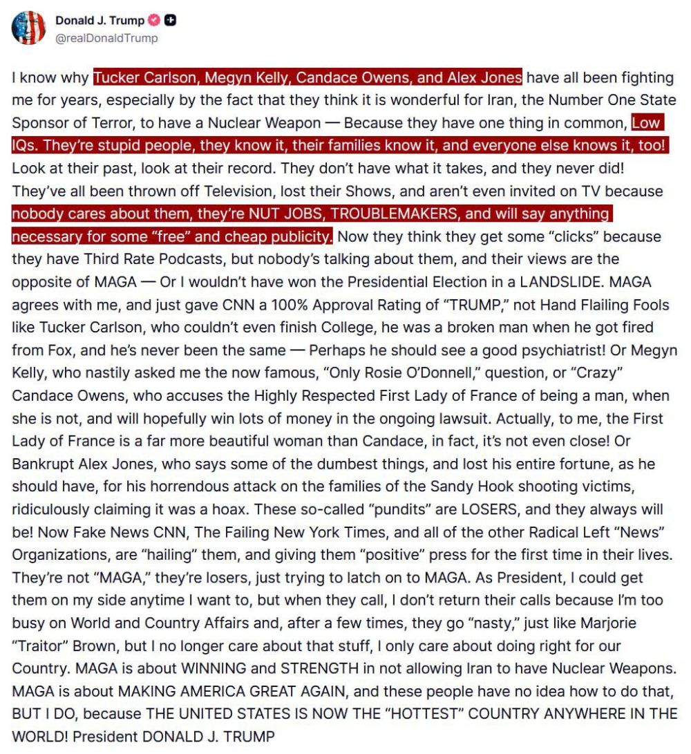 We would mention Tucker Carlson, Alex Jones, Joe Rogan, Marjorie Taylor Green, as household names, with perhaps a few others, that were known not only for their endorsement of Trump, but in many ways some of the key figures who helped define what MAGA was. And now this season an apparently unhinged, insane, compromised, or senile Trump took to “Truth Social” the other day to get it all clearly into the open what he personally thinks about these characters, and it wasn’t pretty.