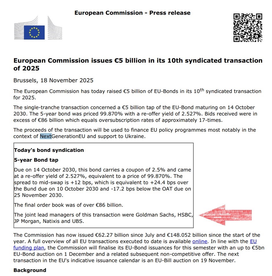 HSBC, Goldman Sachs International, J.P. Morgan, and Barclays, all with significant London operations, acted as joint lead managers on EU syndicated bonds in connection with the then unprecedented NextGenerationEU which we can see here also funds their war in Ukraine, and the case of the €90 billion scheme, is entirely based on the above model and precedent. These banks are incentivized to prolong the conflict between Ukraine and Russia: ongoing instability ensures sustained demand for bonds, derivatives, and advisory services. But of course it’s deeper, as we have explained: the EU’s political institutions are mere facilitators, providing legitimacy while City of London actors extract profits and also soften up European markets, making this also a geopolitical gambit where the UK is acting with malice towards the EU member states and their citizens, though in apparent collusion with the EU Commission and the “Eureaucracy” at large.