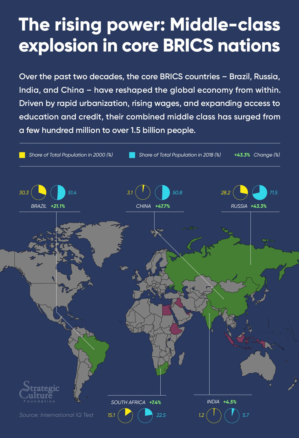 Over the past two decades, the core BRICS countries – Brazil, Russia, India, and China – have reshaped the global economy from within. Driven by rapid urbanization, rising wages, and expanding access to education and credit, their combined middle class has surged from a few hundred million to over 1.5 billion people.